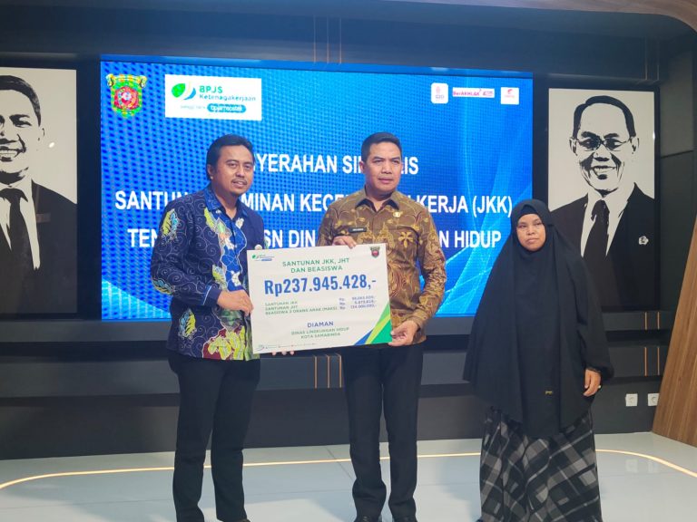 Insitekaltim,Samarinda – Pemerintah Kota (Pemkot) Samarinda bersama Badan Penyelenggaraan Jaminan Sosial (BPJS) Ketenagakerjaan Cabang Samarinda menyerahkan santunan kematian kepada keluarga almarhum petugas kebersihan dari Dinas Lingkungan Hidup.