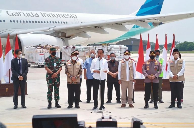 “Indonesia memberikan bantuan kemanusiaan berupa kurang lebih USD 1 juta bantuan dana tunai dan bantuan barang-barang yang hari ini segera kita berangkatkan. Yang pertama dua pesawat,” kata Jokowi