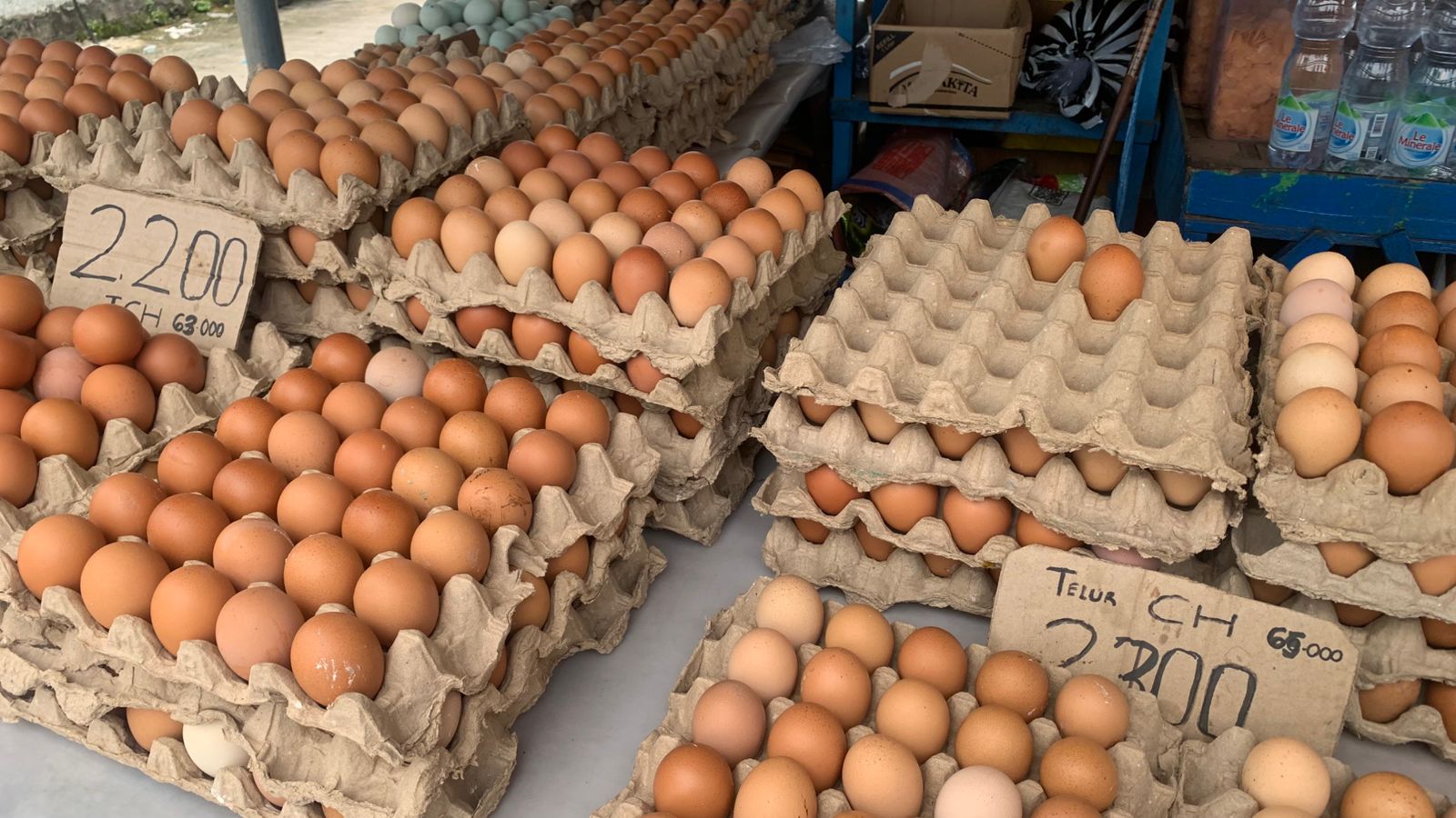 Ia menyebut telur yang dijualnya berasal dari luar daerah, tepatnya dari Sidrap, Sulawesi Selatan. Kondisi pasokan dari daerah asal turut memengaruhi harga di tingkat pedagang.
