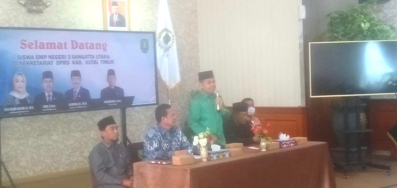 Insitekaltim, Sangatta – Ketua DPRD Kutim Joni bersama Wakil Ketua II Afran dan beberapa anggota lainnya menerima kunjungan siswa Kelas VII SMP Negeri 3 Sangatta di Sekretariat DPRD Kutim, Kamis (3/11/2022).