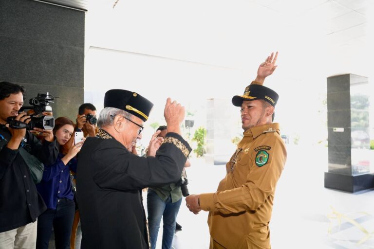 Setelah menyaksikan tarian khas Kutai Kartanegara, Gubernur Rudy disambut hangat seluruh perangkat di lingkup Pemprov Kaltim berjejer menuju Ruang Serba Guna Ruhui Rahayu, Kantor Gubernur Kaltim.